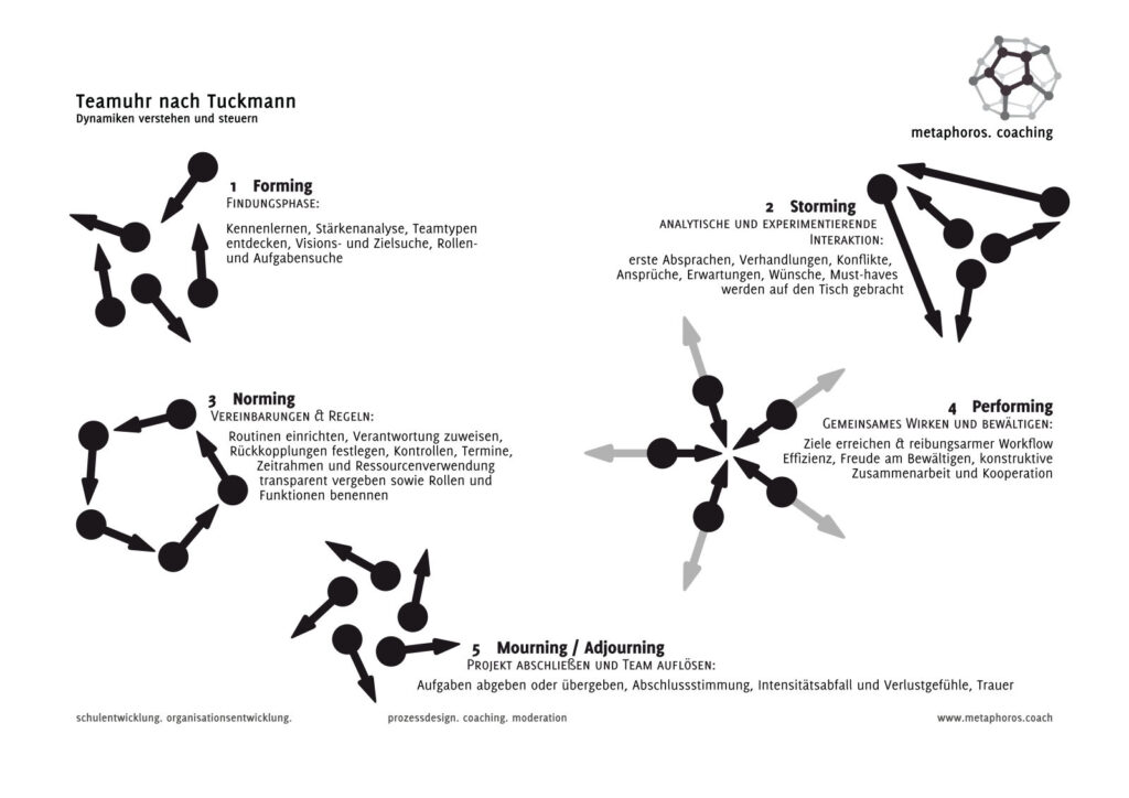 Wir schauen auf den Status des Teams (Riemann-Thoman), auf die Kompetenzverteilung (Kompetenzrad), wir erkunden Hauskommunikation und den Wissenstransfer (SECI nach Nonaka/Takeuchi), stellen einen Team-Steckbrief zusammen und schauen auf Problemklärung nach TZI (Ruth Cohn)